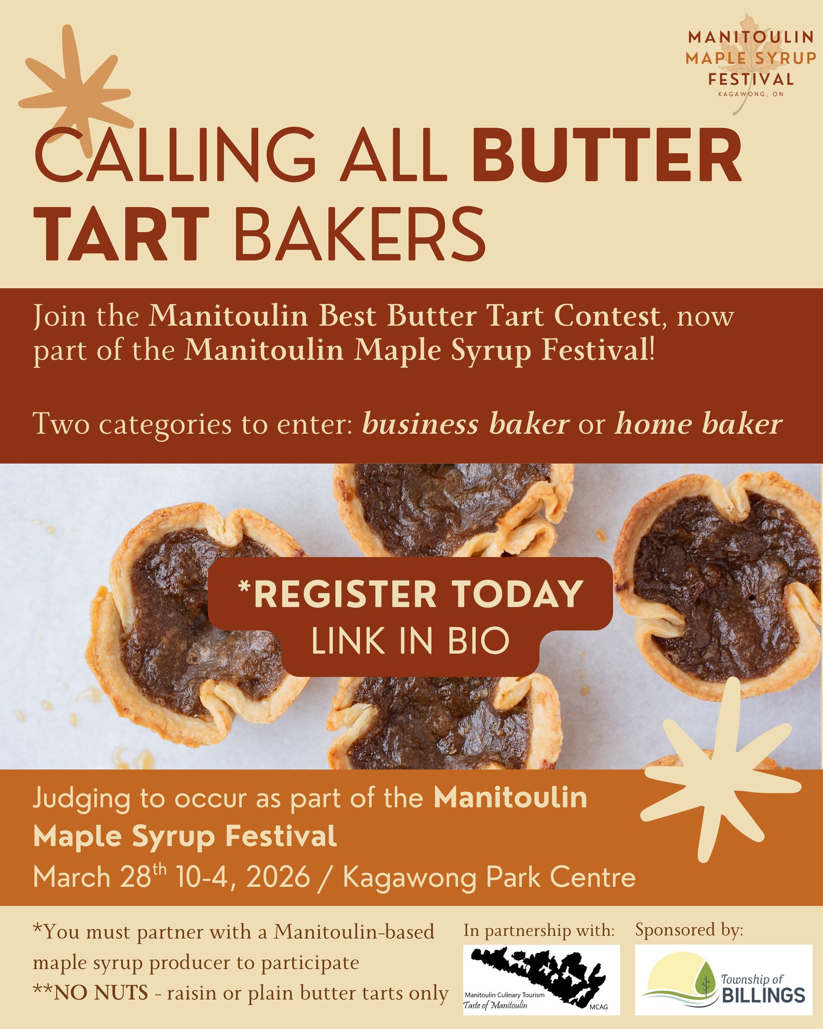 The Manitoulin Island Best Butter Tart Contest is back for 2026, now part of the Manitoulin Maple Syrup Festival!